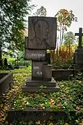 Despite this the cemetery was not considered to have any particular artistic or historical value during the Soviet period. It was closed in 1927 and sporadic efforts were made during the 1930s and 1940s to eliminate it, with the graves of several prominent figures were transferred to the Lazarevskoe, Tikhvin and Volkovo cemeteries; including Vera Komissarzhevskaya, Ivan Goncharov, Anton Rubinstein and Boris Kustodiev.[1][2] Other graves were lost or destroyed.[3] The Church of St Nicholas was closed in 1932, and the cemetery fell into neglect.[4]