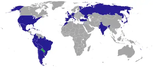 1. ^ a b c d e f g h i j k l m n o p q r s t u v w x y z aa ab ac ad ae af ag ah ai aj ak al am an ao ap aq ar as at au av aw ax ay az ba bb bc bd be bf bg bh bi bj bk bl bm bn bo bp bq br bs bt bu bv bw bx by bz ca cb cc cd ce cf cg ch ci cj ck cl cm cn co cp cq cr cs ct cu cv cw cx cy cz da db dc dd "Representaciones Extranjeras Acreditadas en Paraguay" [Foreign Representatives Accredited in Paraguay]. Ministry of Foreign Affairs of Paraguay (in Spanish). Retrieved 18 September 2024.