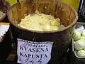 Kapusta kiszona duszona Europe Poland A Polish dish of braised or stewed sauerkraut or cabbage, with bacon, mushroom and onion or garlic. It is seasoned with salt, pepper and sometimes bay leaf, caraway seeds, sugar, paprika and apples.