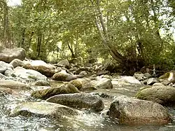 The Aegean Sea catchment basin drains the Thracian Plain and most of the higher lands to the south and southwest. Several major rivers flow directly to the Aegean Sea. Many of their tributaries fall swiftly from the mountains and have cut deep, scenic gorges. The 480 km–long Maritsa (of them 321 km in Bulgaria) and its tributaries drain all of the western Thracian Plain, most of Sredna Gora, the southern slopes of the Balkan Mountains, and the northern slopes of the eastern Rhodopes. After it leaves Bulgaria, the Maritsa forms most of the Greco-Turkish border.[4] Maritsa's major tributaries are the Tundzha, Arda, Topolnitsa, Vacha, Stryama, etc. The other Bulgarian rivers flowing directly to the Aegean are the Struma and the Mesta.[3][4]