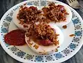 India A dessert made with flour, soaked rice, and molten jaggery, fried with oil, and topped with sesame or poppy seeds.