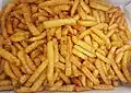 A snack is a small portion of food eaten between meals. They may be simple, prepackaged items; raw fruits or vegetables; or more complicated dishes but are traditionally considered less than a full meal. This list is in alphabetical order by snack type and name.