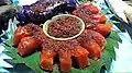 Burmese fritters Myanmar Traditional fritters consisting of battered and fried vegetables or seafood, typically served with a sweet and sour tamarind-based sauce. Examples are gourd buthi-kyaw and chickpea be-gyun kyaw.