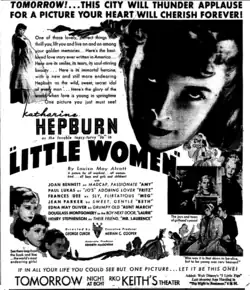 Little Women is a 1933 American pre-Code drama film directed by George Cukor and produced by Merian C. Cooper and Kenneth MacGowan. It stars Katharine Hepburn, Joan Bennett, Frances Dee, and Jean Parker. The screenplay, written by Sarah Y. Mason and Victor Heerman, is based on the 1868–1869 two-volume novel of the same name by Louisa May Alcott. Sets were designed to closely resemble Alcott's house, and costumes were styled to represent the March family's poverty. The film, which broke box office records, is considered one of RKO's most-liked with audiences in 1933. It has received generally positive reviews from film critics, both in the 1930s and more recently. Little Women has been nominated for and won multiple awards. It is the third screen adaptation of the book and the first adaptation with sound.[3] It follows two silent versions made in 1917 and 1918. It has also inspired multiple adaptations and commercial products, being compared favorably to other film adaptations of the novel. It received an Academy Award for Best Adaptation and was nominated for additional Academy Awards.