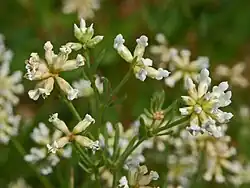 Lotus dorycnium, previously known by the synonym Dorycnium pentaphyllum,[1] common names: prostrate Canary clover and badassi,[2] is a herbaceous perennial plant belonging to the genus Lotus of the family Fabaceae.[1]