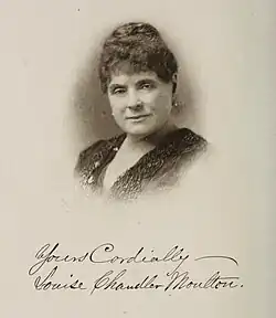 Lilian Whiting's biography (Louise Chandler Moulton, Poet and Friend. Illustrated. Boston: Little, Brown & Co., 1910) was direct and clear in its method, chronological and narrative rather than critical, compiled largely from the letters of Moulton and from the journal that was kept faithfully from age eight to the last days of failing health. With due acknowledgment of Moulton's gifts of personal charm and poetic sentiment and refinement, few discriminating readers ascribed to her verses that quality of genius. So it was considered unfortunate that Whiting began her biography with this word, as one of the implied characteristics of her subject. In her general treatment of Moulton's poetry, however, Whiting showed justice and reserve as well as sympathetic appreciation.[16]