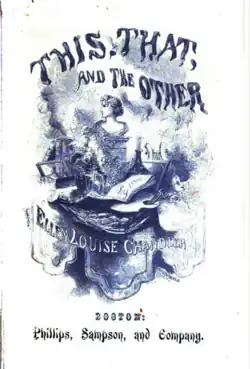 At the age of 15, Moulton began to publish the work which she had written for the past eight years. It would be difficult to say what it was that inclined her to a literary life as she had no literary friends. She felt her movements had to be secret as if she were committing a crime when she sent off her first verses to a daily paper published in Norwich, Connecticut. It was on her way from school one day that she happened to take the paper from the office; and, when she opened it, there were the lines she had written. Three years later, Messrs. Phillips, Sampson and Company, of Boston, published for her "This, That, and the Other," a collection of stories and poems which had appeared in various magazines and newspapers.[3]
