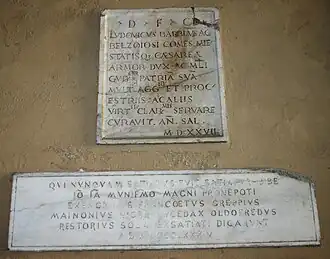 Plaque (top) in honour of Belgiojoso at the Palazzo Trivulzio