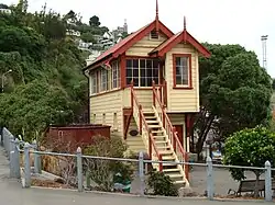 With several alterations and additions, that station served Lyttelton for 90 years, until replaced by a modern structure in 1963. The station offices were at right angles to the passenger platforms, originally on the western side of Oxford Street, but moved to the other side of that street in about 1882.[7] The platform was lengthened in 1903 to accommodate an additional two carriages, necessitating the relocation of the lamp room to a position near the engine shed. The railway stores shed was destroyed by fire, presumed to be arson, on 6 November 1937. Following the removal of a siding to Kinsey & Company's store near the station, a 50-foot (15 m) extension of the platform at the west end was authorised in 1950, because of difficulties in placing mixed consists (a common practice at the time) at the platform.