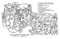 The M939 and M939A1 models use a Cummins NHC 250, a 855 cubic inches (14.0 L) naturally aspirated inline 6 cylinder diesel engine developing 240 horsepower (180 kW) at 2100 rpm and 685 pound force-feet (929 N⋅m) of torque at 1,500 rpm.[8] This was the standard engine of the M809 series. The M939A2 models use a newer and smaller Cummins 6CTA8.3 504 cubic inches (8.3 L) turbocharged inline 6 cylinder diesel engine developing 240 horsepower (180 kW) at 2100 rpm and 745 pound force-feet (1,010 N⋅m) torque at 1,500 rpm.[4][9][10]