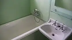 The windows were provided with counterweights and retractable fly screens and could be lowered down into the wall opening as in a railway carriage. A factory built steel wall, which included the water and waste water pipes, was installed between the kitchen and bathroom with the particularity that the bathtub of the narrow bathroom protruded through the wall to save space in the cabinet of the sink. Closets were used to build the remaining interior walls.[6] The quality of the MAN steel houses proved to be excellent in comparison to the competition of that time. Due to the good thermal insulation, the hot-dip galvanized components and the heat treated paints, there were very little corrosion and condensation problems.[7]