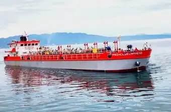 MT Princess Empress, the oil tanker that caused the oil spill, is owned by RDC Reield Marine Services.[8][9] Before it sank, the oil tanker was crewed by 20 people and en route to Iloilo to transport 900,000 liters (240,000 U.S. gal)[c] of industrial fuel oil from SL Gas Harbor Terminal in Limay, Bataan. According to an energy sector source, industrial fuel oil, also known as "black oil", is "highly toxic to the environment".[10]