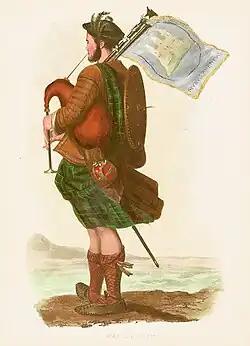 "Mac Cruimin" a Victorian era depiction of a MacCrimmon piper to MacLeod of MacLeod, illustrated by R. R. McIan, from The Clans of the Scottish Highlands, published in 1845. Clearly influenced by the earlier formal painting of a Clan Grant Piper i 1714.
