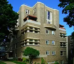 • The Quisling Towers at 1 E. Gilman Street is an apartment building designed by Lawrence Monberg in Art Moderne style and built in 1937 for Dr. Abraham Quisling. Typical of the style, it has some smooth, rounded surfaces, like the streamlined shape of an airplane, along with strong horizontal lines.[29][2]