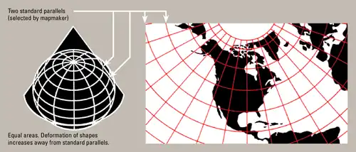 • Equidistant conic, which keeps parallels evenly spaced along the meridians to preserve a constant distance scale along each meridian, typically the same or similar scale as along the standard parallels.