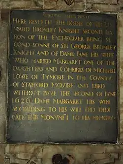 The couple remained childless.[1] When Sir Edward Bromley died in 1626, disputes about the inheritance of the family estates had already begun. The codicil to his will showed that he had been forced to sacrifice some of the lands he had intended as part of Lady Margaret's jointure to placate the Davenports, his great-niece and her husband,[30] who were ultimately to acquire the main estate at Hallon, next to Worfield,[31] after protracted litigation.[32] As compensation, he left her all his moveable property, although he had originally intended to give her only the use of it during her life and the right to bequeath £400-worth in her own will.[30] For everything not relating to the property dispute, Lady Margaret was appointed executrix. Sir Edward set aside £100 for a monument "to be set up in Shifnall Church, or elsewhere, to me and my wife Dame Margaret." However, he directed that his burial itself be "without funeral pompe," probably an indication of Puritan views.[24] He was buried in the church at Worfield, where his wife subsequently had the prescribed monument built, with an inscription attesting her role: "Dame Margaret his wife according to his will did dedicate This monument to his memory."[33]
