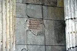 A Greek inscription on the back wall of the Market Gate of Miletus. The inscription is original but its surrounding blocks are modern. It translates to: "For the good fortune of the sacred city council and the sacred fleet! This is the place of the barber Achilleus."