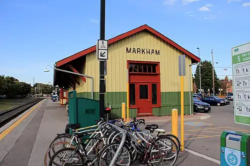 By 1857 most of the township had been cleared of timber and was under cultivation. Villages like Thornhill, Unionville and Markham greatly expanded.[31] In 1851 Markham Village "was a considerable village, containing between eight and nine hundred inhabitants, pleasantly situated on the Rouge River. It contains two grist mills ... a woollen factory, oatmeal mill, barley mill and distillery, foundry, two tanneries, brewery, etc., a temperance hall and four churches... ."[32] In 1871, with a township population of 8,152,[33] the Toronto and Nipissing Railway built the first rail line to Markham Village and Unionville, which is still used today by the GO Transit commuter services.