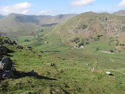 Martindale runs for approximately nine km in a north to south direction, it is a remote and thinly populated valley which has a permanent population of only about 50 residents.[2] The foot of the valley is located at the small hamlet of Sandwick on the western shore of Ullswater, while its head is situated on the slopes of Rampsgill Head where the headwaters of Howegrain Beck rise at a height of around 700 metres (2,300 ft) above sea level. The upper part of the valley is divided into two branches by the fell of The Nab, these two sub valleys named Bannerdale and Rampsgill contain the streams of Bannerdale Beck and Rampsgill Beck which meet at a point midway down Martindale to form Howegrain Beck which then becomes the main watercourse for the lower part of Martindale and enters Ullswater at Sandwick.[3][4] Just before reaching Sandwick, Martindale is joined by the side valley of Boredale, which enters from the south.