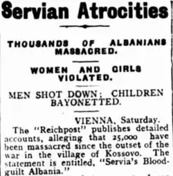 Massacres of Albanians in the Balkan Wars were perpetrated on several occasions by the Serbian and Montenegrin armies and paramilitaries between 1912 and 1913.[1][2] During the 1912–13 First Balkan War, Serbia and Montenegro committed a number of war crimes against the Albanian population after expelling Ottoman Empire forces from present-day Albania, Kosovo, and North Macedonia, which were reported by the European, American and Serbian opposition press.[3] Most of the crimes occurred between October 1912 and the summer of 1913. The goal of the forced expulsions and massacres was statistical manipulation before the London Ambassadors Conference to determine the new Balkan borders.[3][4][5] According to contemporary accounts, around 20,000 to 25,000 Albanians were killed in the Kosovo Vilayet during the first two to four months, before the violence climaxed.[6] The total number of Albanians that were killed in Kosovo and Macedonia or in all Serbian-occupied regions during the Balkan Wars is estimated to be at least 120,000.[7][8][9][10][11][12] Most of the victims were children, women and the elderly.[13][14] In addition to the massacres, some civilians had their lips and noses severed.[15] Multiple historians, scholars, and contemporary accounts refer to or characterize the massacres as: localized genocide, extermination, genocide of Albanians or part of the wider genocide against Muslims. Further massacres against Albanians occurred during the First World War and continued during the interwar period.