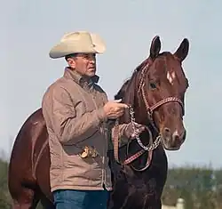 Matlock Rose, born Berry Matlock Rose (1924–2008), was a professional horse trainer for over 60 years. He established a reputation as an all-around cowboy and trainer of champions.[1] Rose was often described as stonefaced, a man of few words, but long held the respect of his peers. He was referred to as a trainers' trainer,[2] and considered a legend.[3] He trained multiple AQHA world champions, five NCHA world champions, was inducted into the American Quarter Horse Hall of Fame in 2001, as well as both the NCHA Rider Hall of Fame and the NCHA Members Hall of Fame. The first famous cutting horse he trained was Jesse James and many other great horses followed but he was best known for training Peppy San and Peponita.[4]