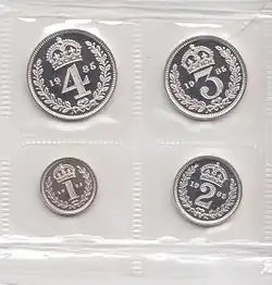 A 1982 Maundy fourpence; like all Elizabeth II Maundy pieces, it bears an obverse design by Mary Gillick which had long-since been replaced by other designs for circulating coins.