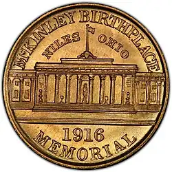 The reverse, designed by Morgan, is intended to be a facing view of the McKinley birthplace memorial in Niles, but according to Swiatek and Breen, "the most charitable view must characterize it as inaccurate and incompetently done".[19] Above the building is "McKinley Birthplace/Niles Ohio", and beneath it the date and "Memorial".[25]