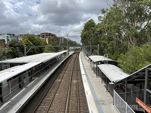 Meadowbank railway station is on the Main Northern railway line. Meadowbank has two side platforms. The station is served by four trains per hour each way, with additional trains on weekday peak hours. The station is within walking distance of Meadowbank ferry wharf served by Sydney to Parramatta ferries.