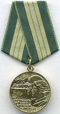 The Medal "For Construction of the Baikal-Amur Railway" (Russian: Медаль «За строительство Байкало-Амурской магистрали») was a civilian award of the Soviet Union established on October 8, 1976, by Decree of the Presidium of the Supreme Soviet of the USSR[1] to recognise active participation in the construction of the Baikal-Amur Railway, a huge multi year project under the leadership of then Soviet general secretary Leonid Brezhnev. The medal's statute was amended on July 18, 1980, by decree of the Presidium of the Supreme Soviet of the USSR No. 2523-X.[2]