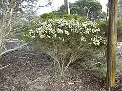 The flowers are white when young but turn reddish as they age. They are in heads at or near the ends of the branches which continue to grow after flowering. Each head contains 2 to 10 individual flowers and is about 15–20 mm (0.6–0.8 in) in diameter. Flowers appear in September and October and the fruit which follow are cylindrical or barrel-shaped woody capsules which retain the sepals as teeth around the edge. The fruit are 5–6 mm (0.20–0.24 in) long and 4–5 mm (0.16–0.20 in) in diameter.[2][3]