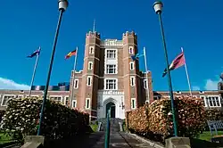 The Twenties Building is a heritage-listed, three-storey rendered brick building in the Collegiate Gothic style,[7][26] which has been nicknamed by students and ex-students as the "Castle on the Hill" based on its appearance and elevated position of the site. The base level contains the school canteen, the dining hall (with microwaves and a rowing boat and canoe hanging inside), two IT rooms and four rooms devoted to mathematics.[1] The ground level serves multiple purposes. The south wing of the ground floor generally functions as geography and mathematics rooms. The north wing of the ground floor is devoted to physics with two large classrooms and a lecture room with raked seating. Between the north and south wings is the school's Memorial Hall, the principal's office and the offices of the assistant principals.[1][7] The first floor of the Twenties building is also split into two wings. The south wing is assigned to history, LOTE and politics. The north wing is assigned to chemistry.[1][7]