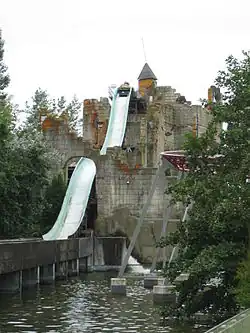 | Splash | 1989 | 1999 | Manufactured by Mack Rides, the ride was inaugurated in 1989 by the Prime Minister of Belgium of the time, Wilfried Martens. Highest and fastest log flume of Europe of the time.[8] It reopened in Plopsaland as Het Kasteel van Koning Samson. In 2007 the ride's name changed for Boomstammetjes. In 2019, the ride was rethemed and is now called DinoSplash. |