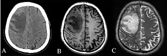 CT and MRI scans showing lesion of the left frontal lobe of the brain.[6]