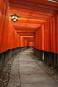 The orange gateways at the Fushimi Inari shrine in Fushimi-ku, Kyoto, used in the scene where a young Chiyo runs through them