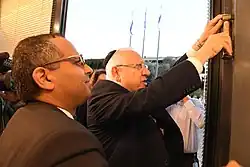 In Karaite Judaism the Deuteronomic verse "And you shall write them on the doorposts of your houses and your gates" (Deuteronomy 6:9; 11:20) is interpreted to be a metaphor and not as referring to the Rabbanite mezuzah.[33] Thus Karaites do not traditionally use mezuzot, but put up a small plaque in the shape of the two Tablets of the Law with the Ten Commandments. In Israel, where they might try not to make other Jews feel uncomfortable, many Karaites make an exception and place a mezuzah on their doorpost as well.[34][35] The Karaite version of the mezuzah is fixed to the doorways of public buildings and sometimes to private buildings, too.[35]