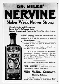 - ^ Griffin, Jessica Archived 2021-01-29 at the Wayback Machine "Dr. Miles Restorative Nervine, Elkhart, Indiana"; Old Maine Artifacts; 30 November 2013.