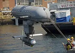 A minehunting ROV of the German Navy with explosive charges underneath the main body
