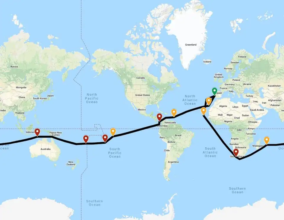 Leg 4: Cape Town to St. Helena (1900 nm), to Cape Verde (2400 nm), to Portugal (1600 nm). (5900 miles)