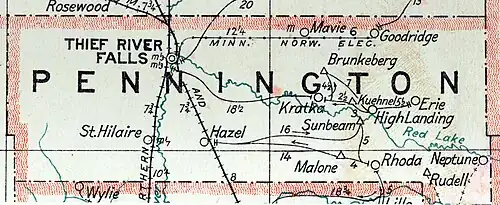 The Minnesota Northwestern Electric Railway was an interurban gasoline-electric railway which operated passenger and freight service between Thief River Falls, Minnesota and Goodridge, Minnesota, operating from 1914 to 1940.[1] The railway also served Silverton Township and Mavie. There were several other stops along the way. The original plan was to extend the line all the way to International Falls, Minnesota, however due to poor finances, the line never extended beyond Goodridge.[2]