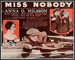 Miss Nobody is a 1926 American silent drama film produced and distributed by First National Pictures and directed by Lambert Hillyer. The film is based on a short story by Tiffany Wells titled "Shebo"; the likely feminine pronunciation of hobo. The stars of the film were Anna Q. Nilsson and Walter Pidgeon, then in an early role in his career.[1] The plot of this film bears a striking resemblance to Beggars of Life, made two years later at Paramount.