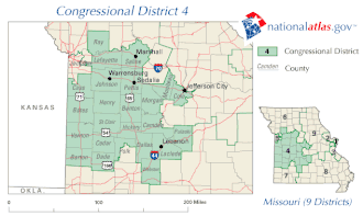 Missouri's 4th congressional district includes all of 20 counties and portions of another 4 counties: Barton,Bates, Benton, Boone (parts), Camden (parts), Cass, Cedar, Dade, Dallas, Henry, Hickory, Howard, Jackson (parts), Johnson, Laclede, Lafayette, Morgan, Pettis, Polk, Pulaski, Saline, St. Clair, Vernon, and Webster (parts).[5]
