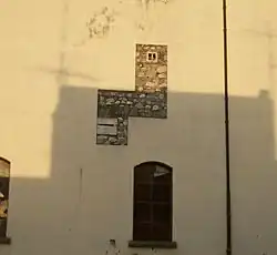Behind the high altar are the remains of the church's old ceramic floor with a wind rose motif. To the left of those viewing the altar is a small window from which the nuns received the Eucharist.