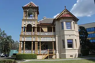Mary Mayne, widow of Patrick Mayne, had purchased the earlier house and 15 acres (6.1 hectares) in 1876.[2] Patrick Mayne was a prominent Brisbane resident in the 1860s-1870s who owned a butcher shop in Queen Street, served as an alderman of the Brisbane Municipal Council and speculated in property. Mary Mayne and her five children resided in Moorlands Villa until her death in September 1889.[1]