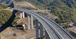 The system has inherited some from the former Yugoslavia, although new sections have been completely built in the recent years. Pay-tolls (Macedonian: patarini) remain in place and the speed limit is 130 km/h (81 mph).[1] The total length of the motorway network as of February 2025 is 317 km,[2] with extra 167 km being under construction. The works on the first couple kilometers of the motorway from Skopje to Kosovo's border started in 2020. The extension of the A2 motorway from Kicevo to Ohrid started in 2014. The part that is supposed to connect Gostivar and Bukojchani, Prilep and Bitola and Trebenishta and Kjafasan started construction by consortium Bechtel & Enka in 2024.[3][4] Furthermore, most stretches of the existing network have been reconstructed, so overall the Macedonian motorways are in decent shape.[5]