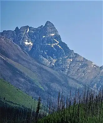 Mount Doody (8,644–8,684 feet (2,635–2,647 m)) is located in the Lewis Range, Glacier National Park in the U.S. state of Montana.[4] Mount Doody is astride the same ridgeline as the Cloudcroft Peaks which are to the immediate northeast. Dan Doody was one of the first six rangers at Glacier National Park.[5] Doody patrolled the Middle Fork drainages, using his own homestead as a headquarters. Later, because of his recognized hunting abilities, Doody became a park hunter skilled at removing "undesirable" wildlife from the area.[6]
