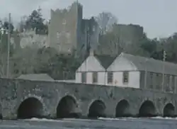 The Suir flowed directly under the watermill, navigated by the weir and mill race, uniquely exiting under an arch of the adjoining historical 14 arch Ardfinnan bridge itself, insuring a powerful flow. It was also along the main road from Dublin to Cork. The mill was likely in this advantageous position since the construction of Ardfinnan Castle, as a source of milled flour for the knights, but the oldest surviving account is in the 17th century.[5] The earliest mill here would have adjoined the monastic site before the present castle, said to be founded by Saint Finnan (for which Ardfinnan is named) in the 6th century, with Saint Carthage laying the foundations for Lismore Abbey from here. Strong local traditions of independent hand-weaving and spinning, provided a skilled local workforce.[6] It is believed the traditions date back to the monastic settlement and cloth fulling at the mill by the Knights Templar of Ardfinnan Castle. A William le Teynturer (William the Dyer, of cloth) is recorded in the village in 1295.[7]