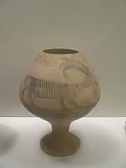 Apart from pottery and painted pottery, other artifacts found include crude humped bulls, human figures, shaft hole axes, adzes of bronze and terracotta drains.[22] Painting on pots include pictures of sacred fig leaves (ficus religiosa) and a tiger-like animal.[36] Several stone button seals were also found at Mundigak.[37] Disk Beads and faience barrel beads,[38] copper stamp seals, copper pins with spiral loops were also found.[39]