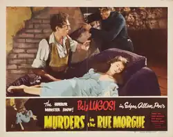 On February 10, Murders in the Rue Morgue opened at New York's RKO-Mayfair Theatre.[14] A report in Variety noted the crowd "hooted the finale hokum".[14] The film made $21,000 in its week at that theater but did poor business nationally in comparison to Dracula and Frankenstein.[14] Murders in the Rue Morgue was released on February 21, and was distributed theatrically by Universal Pictures.[2][3] Censor boards in the United States abbreviated scenes showing the death of the prostitute and removed shots of her being stabbed and of her tied up in a laboratory.[3] Censors also removed scenes with dancing girls and elements of the plot that suggested man evolved from apes.[3] According to the American Film Institute, despite some sources listing the film's running time as 75 minutes, the group could find no proof it ran at this length.[3] According to the entry on the films database, nearly all sources give the film a running time of 62 minutes, except for Film Daily, which gave it a running time of 75 minutes.[3] In March 1947, Universal announced it would re-release Dracula (1931) and Frankenstein (1931) on a double bill.[15] After playing in Los Angeles, Murders in the Rue Morgue continued to be run in theaters, leading to more theatrical re-issues by Realart Pictures towards the end of the 1940s. Murders in the Rue Morgue was re-released theatrically in 1949.[16]