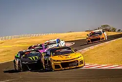 The current generation of Chevrolet Camaro bodied NASCAR Brasil race cars racing at Autódromo Velo Città in 2020.