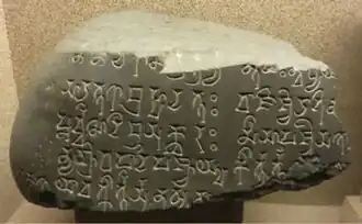 The Nagajari-Khanikargaon rock inscription is a 5th-century land grant discovered in the Nagajari area of the Golaghat district.[1] The artifact is fragmentary, with inscriptions in Sanskrit written in the eastern variety of the Brahmi script.[2] In style, language, and script, the inscription is very similar to the Umachal and Barganga rock inscriptions. Additionally, since it betrays no influence of a local Prakrit, this inscription is often placed earlier than the Umachal rock inscription. It also indicates that Indo-Aryan culture had spread to the Golaghat region by the 5th century.[3] It is also speculated that it might belong to a different dynasty unrelated to the Varmans of Kamarupa.[4]